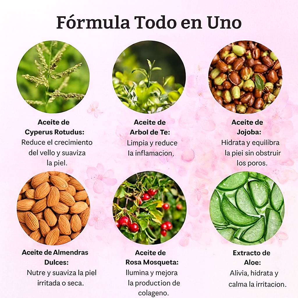 Su mezcla de aceites nutritivos —jojoba, almendra dulce y rosa mosqueta— deja la piel suave, hidratada y más pareja, mientras que el aloe vera y el árbol de té ayudan a calmar la irritación después de depilar o rasurar.