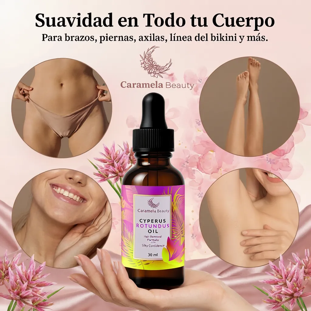 Vellessa™ es un aceite corporal botánico formulado con extracto de Cyperus Rotundus, un activo natural que ayuda a ralentizar el crecimiento del vello con el uso constante.